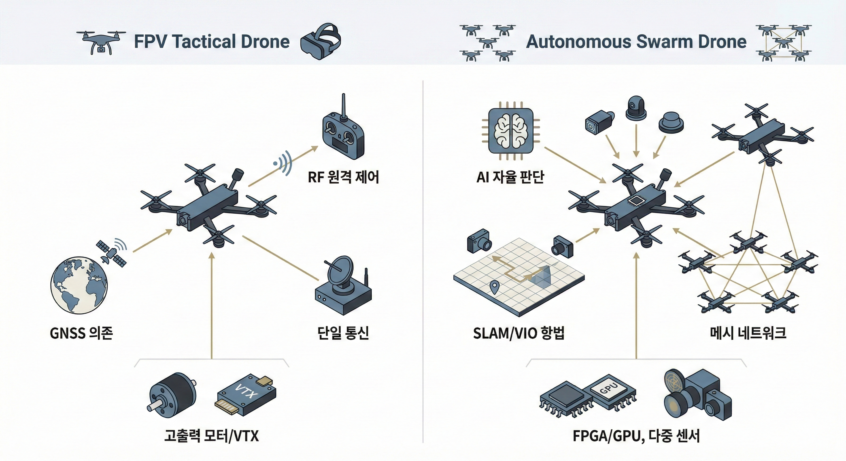| 주요 하드웨어 | 고출력 BLDC 모터**, 아날로그/디지털 VTX** | FPGA/GPU 가속기**, 다중 센서 어레이** |