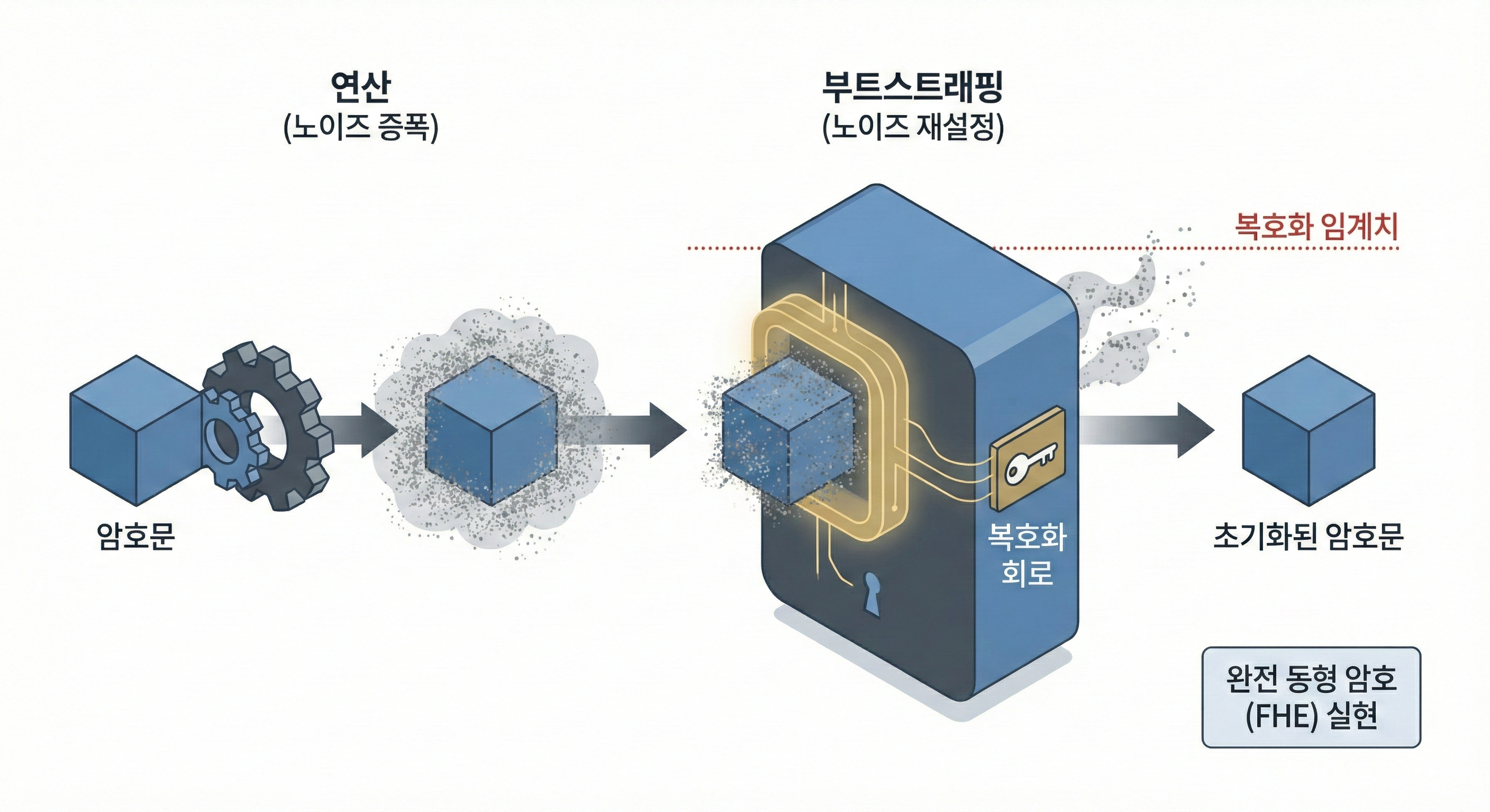 **부트스트래핑: 연산 중 증폭된 노이즈가 복호화 임계치를 초과하여 원본 데이터를 오염시키기 전, 암호화 상태에서 노이즈 레벨을 강제로 재설정하는 핵심 공정이다. 암호문 내부에 복호화 회로를 구현하여 노이즈를 제거함으로써, 연산 횟수의 제약이 없는 완전 동형 암호(FHE)를 아키텍처 수준에서 실현한다. 이는 데이터의 가용 범위를 유지하는 결정적인 장치이나, 막대한 연산 비용을 수반하는 시스템적 병목 구간으로 작용한다.