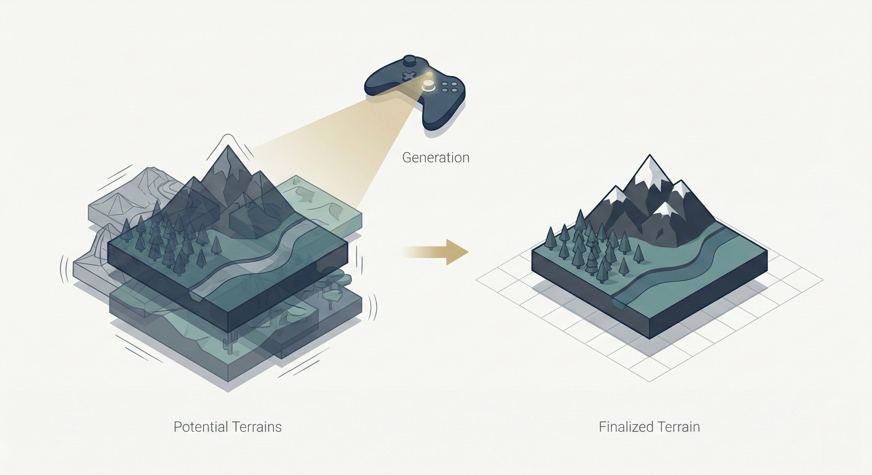 WFC의 핵심은 결정하기 쉬운 곳부터 해결하는 전략이다. 시스템 아키텍처는 가능한 경우의 수가 가장 적어 불확실성(Entropy)이 낮은 노드를 우선 선택해 상태를 확정한다. 하나의 노드가 결정되면 그 결과는 논리적 제약 조건에 따라 주변으로 전파(Propagation)되며 인접 노드들의 선택지를 제한한다. 이는 연쇄 반응처럼 이어져 전체 시스템의 복잡한 상태를 모순 없이 완성하는 구조를 형성한다.