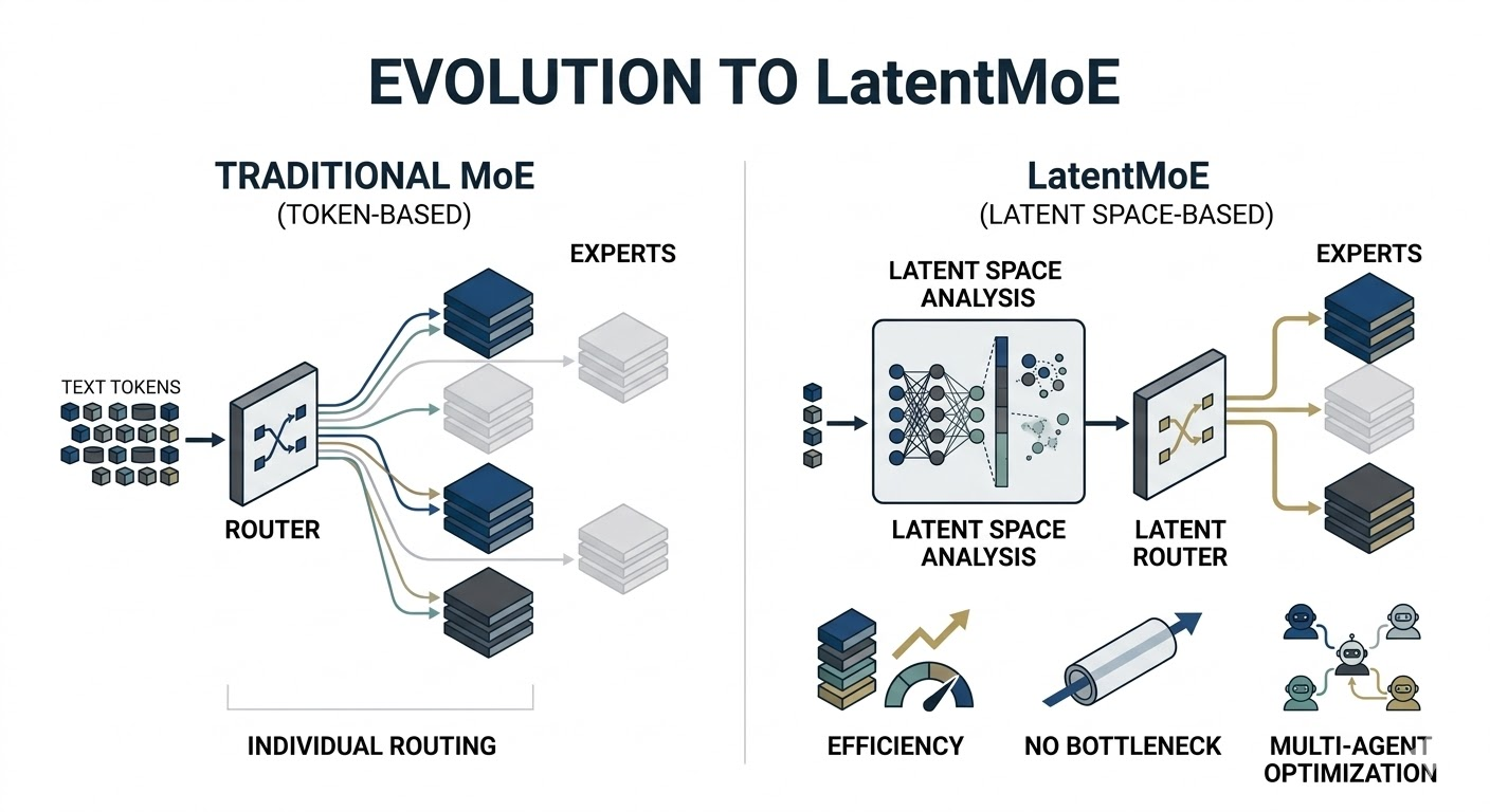 **Latent MoE: Latent MoE는 Mixture-of-Experts(MoE)의 진화된 형태로, 입력을 최적의 전문가(Expert) 모델로 배분하는 매개변수 라우터다. 기존 MoE가 개별 토큰 단위로 라우팅을 수행했다면, Latent MoE는 잠재 공간(Latent Space)에서 특징을 분석하여 연산을 분배한다. 이 구조는 전체 파라미터 중 극히 일부만 활성화(희소 활성화)하여 연산 효율을 극대화하고 메모리 대역폭 병목을 해소한다. 특히 멀티 에이전트 환경에서 작업 특성에 맞는 전문가를 정교하게 선택하여 추론 속도를 높이고 시스템 부채를 줄이는 핵심 역할을 수행한다.